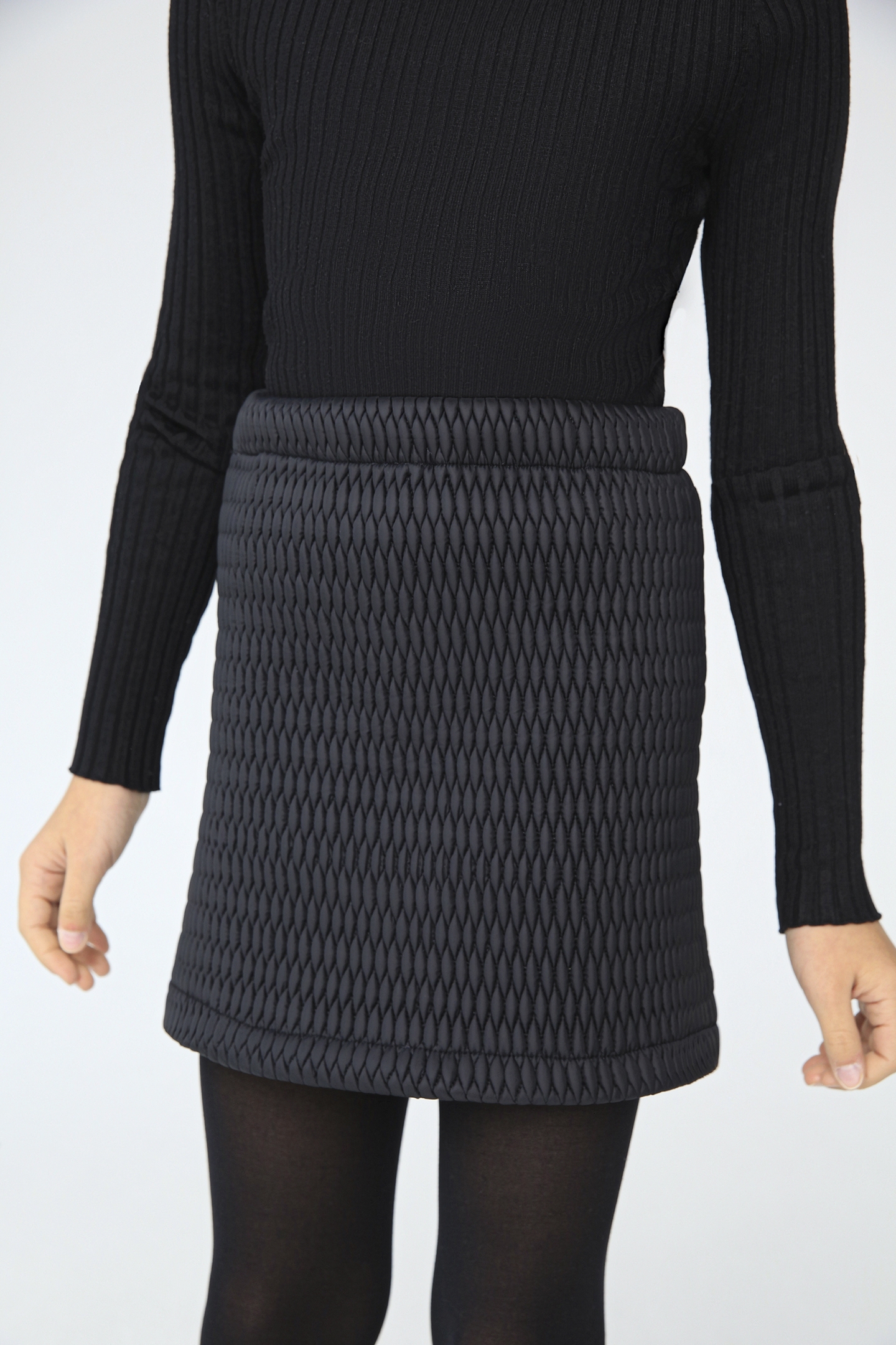 Модная черная юбка для девочек рассчитана на зиму и позднюю осень. Короткая повседневная модель прямого кроя отлично смотрится с плотными колготками разных оттенков и легинсами. В нее можно заправлять водолазки, футболки, рубашки или комбинировать с широкими худи, свитшотами и школьным пиджаком. Фигурная простежка и ткань с легким блеском делает юбку простого фасона оригинальной и эффектной.